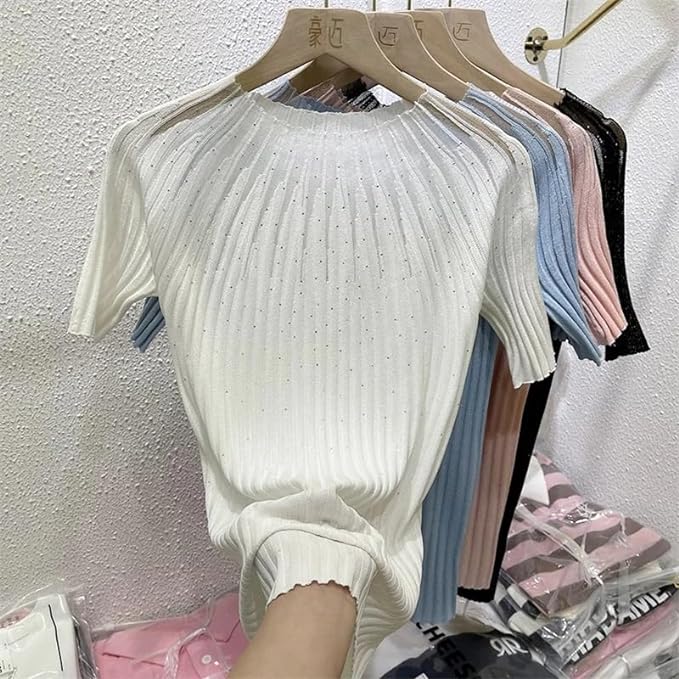 • ICW Women Knit Rhinestone Embellised Mesh Crop Top T-Shirt (One Size Bust 28-34 Inch) 107